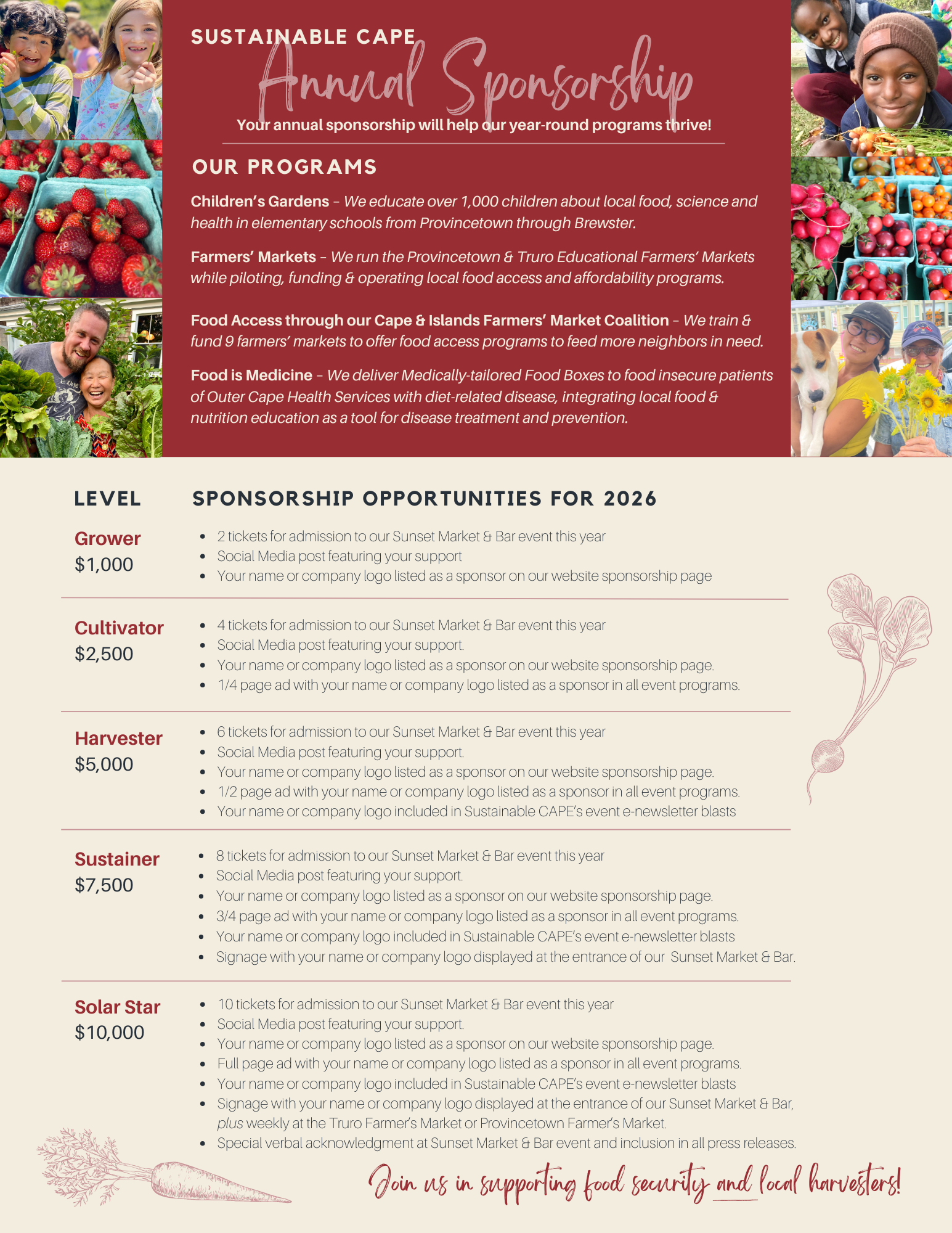 By becoming a sponsor, you’ll directly support Sustainable CAPE’s children’s gardens, farmers’ markets and food security efforts in our community. Each dollar raised will help us combat hunger while benefiting the farmers & fishers whose daily efforts nourish us.